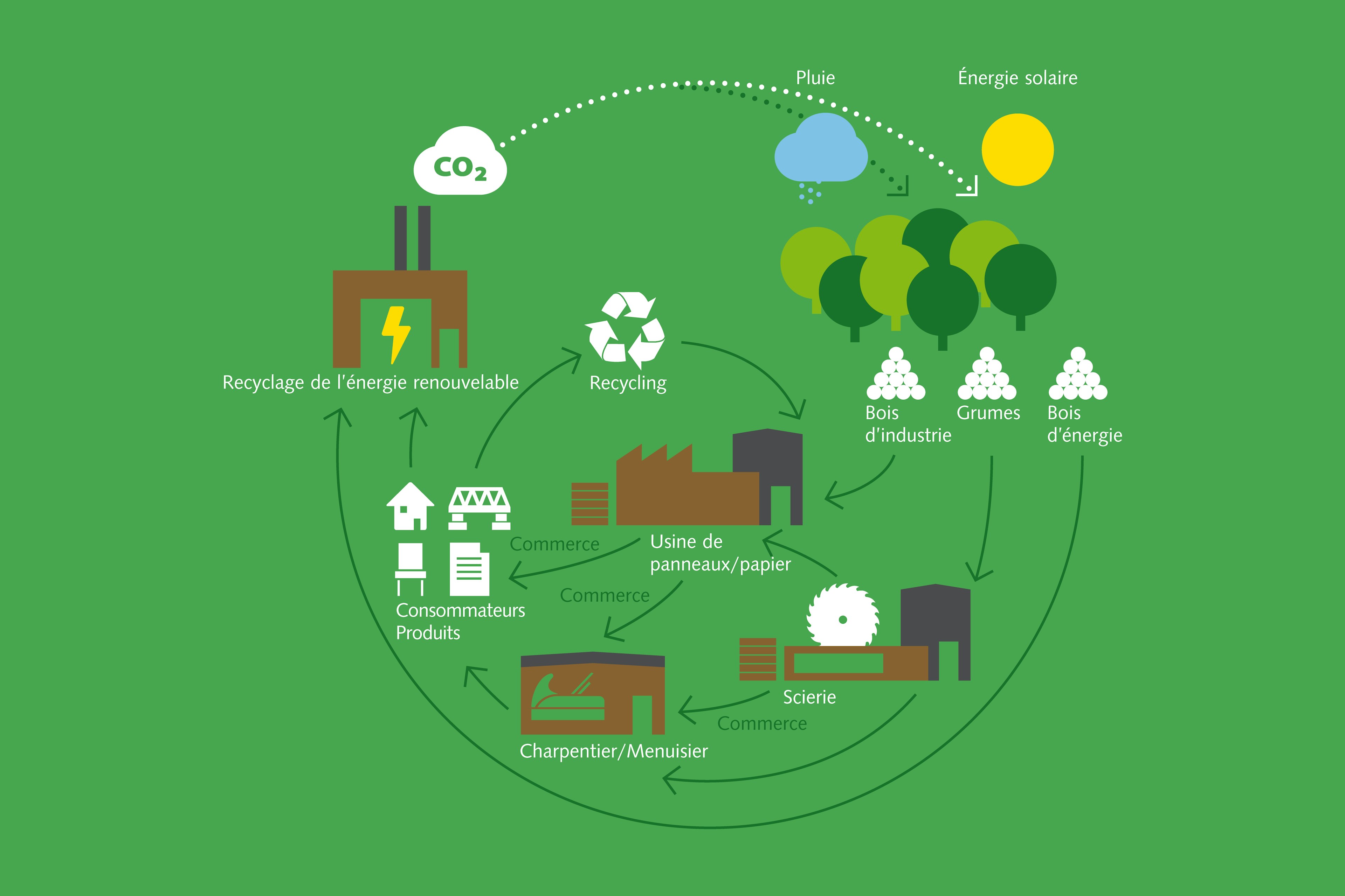 La forêt et le bois s’inscrivent dans un cycle naturel. Chaque arbre capture le CO2 de l’atmosphère pour le transformer en carbone. Après la récolte de l’arbre, le carbone reste séquestré dans les produits en bois, tandis que la forêt absorbe toujours plus de CO2 avant de le décomposer en biomasse. Du fait de son accroissement naturel, le bois peut être exploité en continu, ce qui permet à une « deuxième forêt » de se développer à son tour sous la forme de produits en bois. Il est important de prolonger au maximum le bénéfice climatique du système forêt-bois dans sa globalité. D’où l’intérêt d’utiliser la matière première en cascade : d’abord pour les applications hautement qualitatives, puis de basse qualité, puis comme source d’énergie. Si le bois sciable est d’abord utilisé principalement dans des produits durables et de haute qualité tels que les maisons, les aménagements intérieurs et le mobilier, le carbone atmosphérique qu’il renferme reste fixé pendant de nombreuses décennies. Suivent alors les autres applications du même matériau, de la plus qualitative à la moins qualitative, jusqu’à ce son ultime usage comme source de chaleur et d’électricité. Et c’est là que l’économie circulaire entre en jeu.